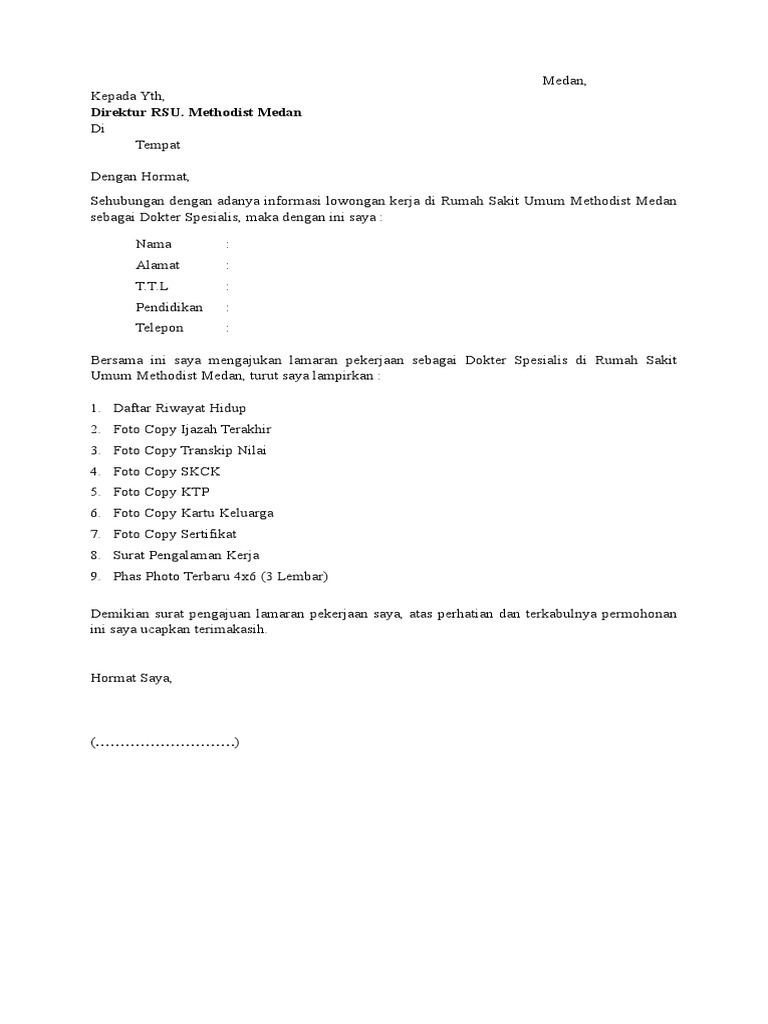 Untuk menyongsong pekerjaan kamu, kamu butuh contoh surat lamaran kerja umum untuk melamar pekerjaan sebagai dokter. Contoh surat lamaran kerjadokter umum. Demikianlah surat lamaran ini saya buat dengan sebenarnya dan atas perhatian serta kebijaksaan pimpinan bpjs kesehatan saya mengucapkan terima kasih hormat saya, dendy dwi ramadhani wlingi, 18 maret 2014 perihal:permohonan pengajuan kepada dokter keluargayth. Bersama surat lamaran pekerjaan ini, izinkan saya mengajukan diri sebagai dokter spesialis kulit yang bertugas di rumah sakit karya abadi jakarta, sesuai dengan posisi yang dibutuhkan. Contoh surat lamaran kerja dokter. Ketika akan membuat sebuah surat lamaran, pelamar biasanya juga menyertakan posisi atau jabatan yang dia inginkan di dalam surat lamaran terebut. Dan untuk memenuhi kebutuhan tersebut, maka seseorang harus memiliki penghasilan secara terus menerus. Yang perlu diperhatikan adalah, anda melihat terlebih dahulu bagian ketentuan di cpns periode 2. Bersama ini saya mengajukan lamaran pekerjaan sebagai dokter spesialis di rumah sakit umum methodist medan, turut saya lampirkan Nah, itulah salah satu contoh surat lamaran cpns yang dapat kami sampaikan. Ini contoh surat lamaran dokter yang dtijukan untuk ke rumah sakit dalam bentuk microsoft word. Untuk pendaftaran cpns 2021 dilakukan melalui portal resmi badan unggah surat lamaran bermaterai ditujukan kepada menteri komunikasi dan informatika ri di dokter dan dokter gigi, dengan kualifikasi pendidikan dokter spesialis dan dokter gigi spesialis. Format penulisan surat lamaran kerja, beberapa tips dan contoh surat lamaran kerja secara 10.